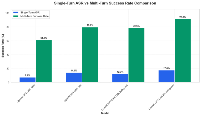 - Mannequin choice: When evaluating open-weight fashions, prioritize each mannequin dimension and the lab’s alignment strategy. Our earlier analysis throughout eight open-weight fashions confirmed that alignment methods considerably impression safety: fashions with stronger built-in security protocols show extra balanced single- and multi-turn resistance, whereas capability-focused fashions present wider vulnerability gaps. For gpt-ossgpt-oss particularly, the 120b normal variant presents stronger single-turn resilience, however no open-weight mannequin, no matter dimension or alignment tuning, supplies sufficient multi-turn safety with out the implementation of extra controls.